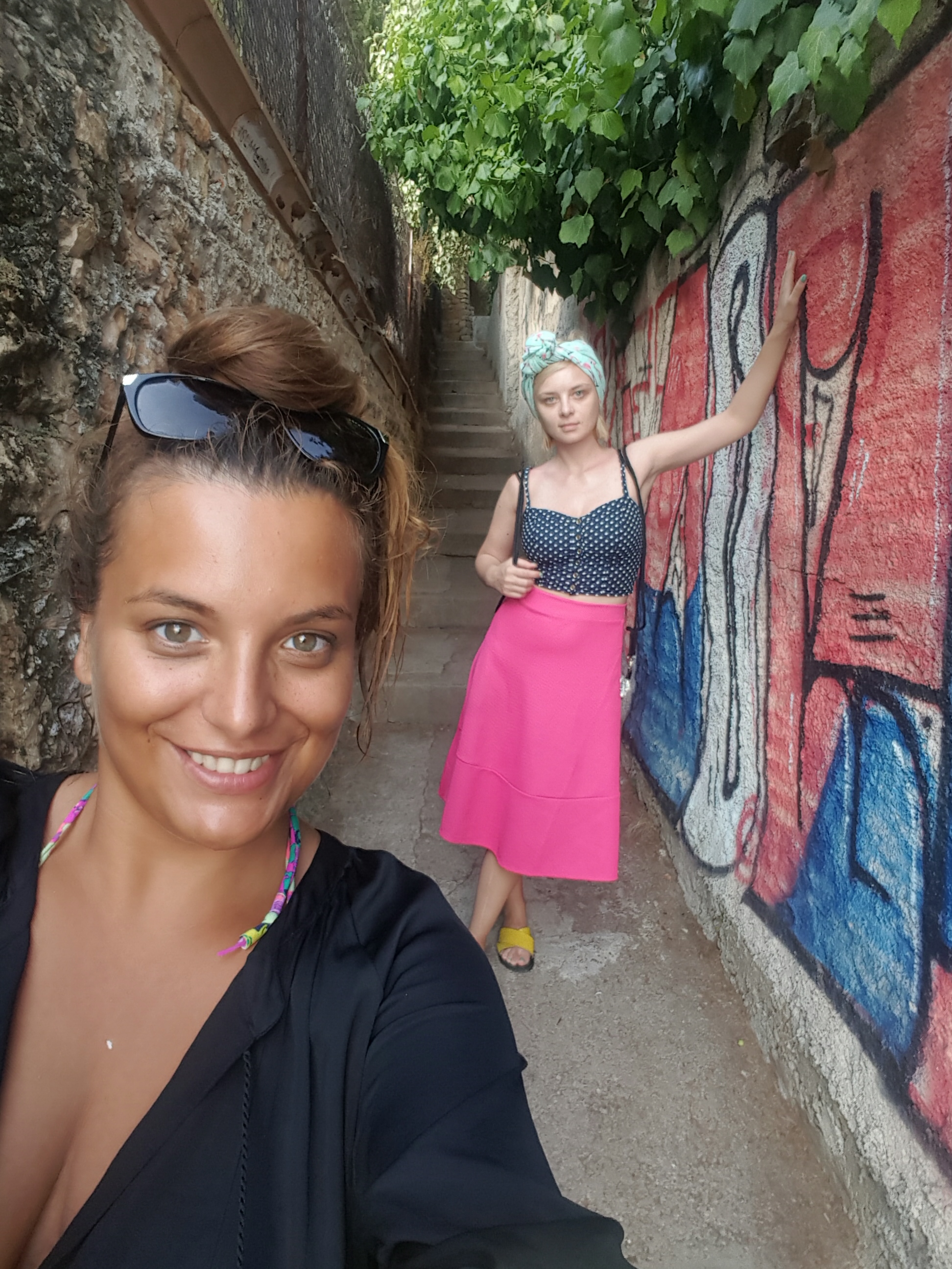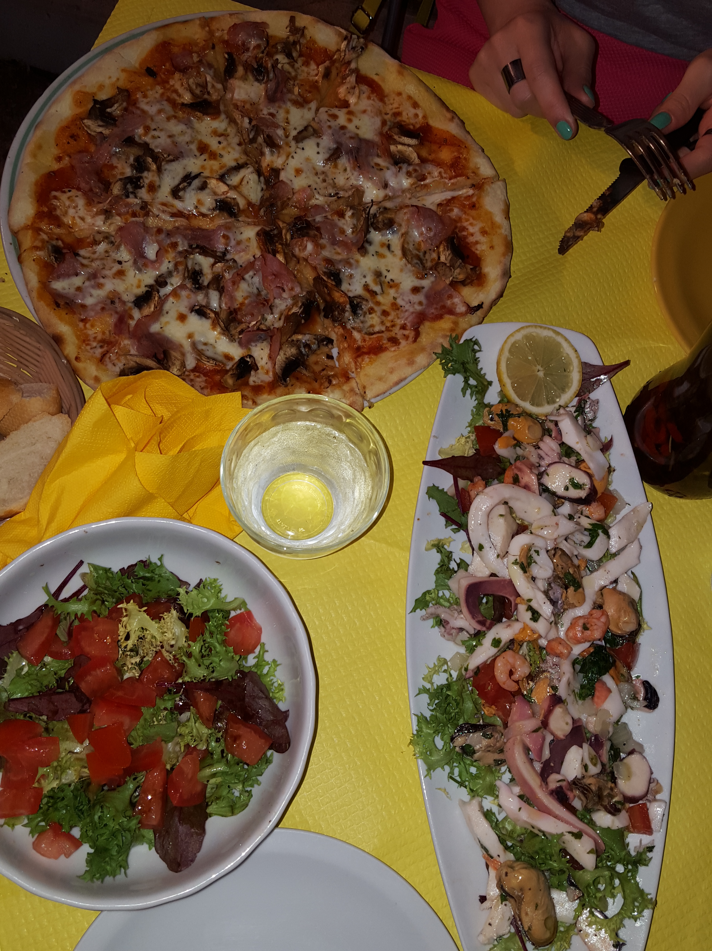 If you are into a late snack, nothing fancy, just to grab a bite while having a glass of wine I can suggest going to Mylady. (just at the base of the small uphill alley who leads to Al Dente)Their bruschettas are delicious, big, and cheap- like about 8,5 euros each. You can a have or not a Greek salad aside. We couldn’t help not try it with the salad:) 2015-08-09 09.02.09