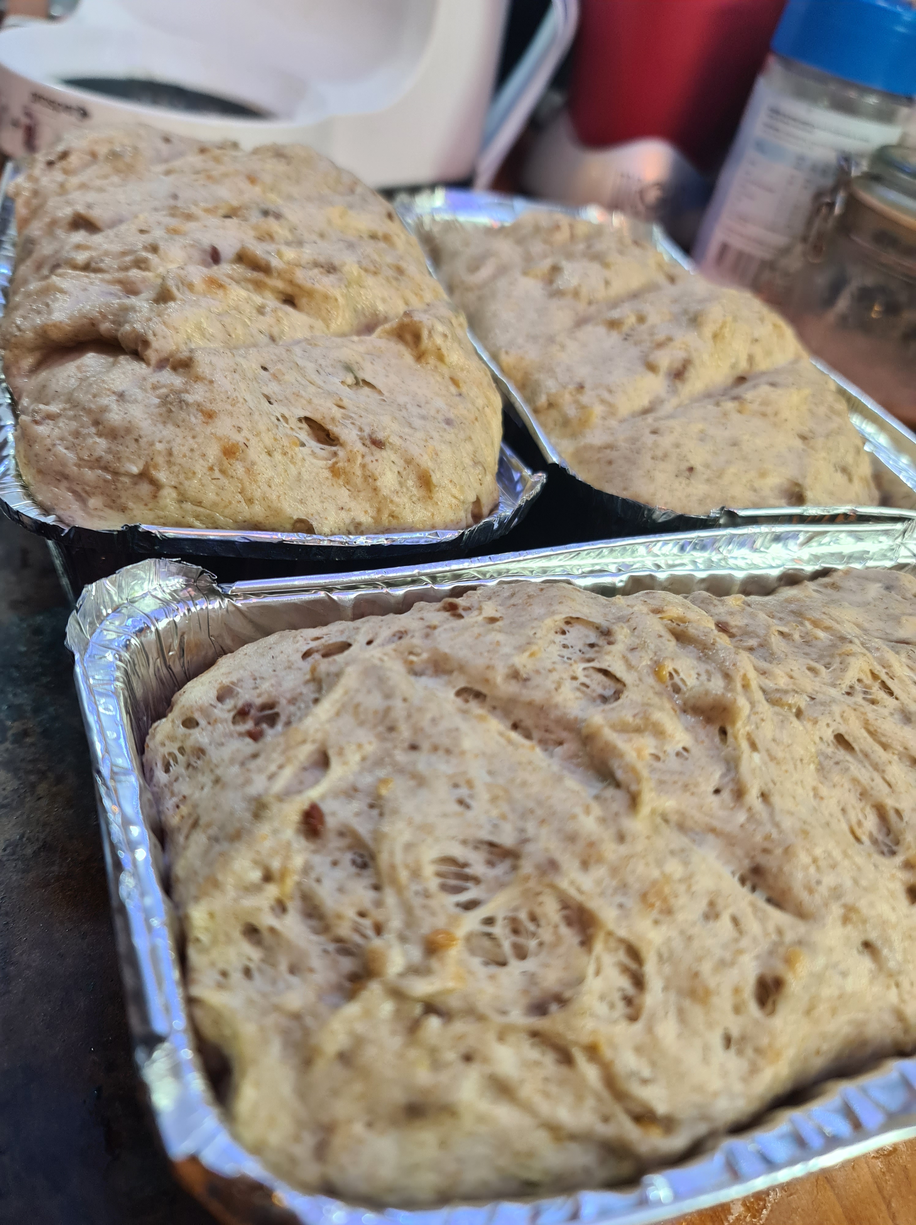 Am pus aluatul la crescut, la caldura. Am pus folie si prosop deasupra si am pus-o pe aragaz si cuptorul aprins. Dupa 1h30 isi dublase volumul. Am impartit aluatul in 3 si l-am pus in tavi mai micute de aluminiu de unica folosinta, fara sa le mai ung cu nimic. Le-am lasat inca 30 mim sa creasca in forma. Le-am uns cu lu batut cu putina apa si am presarat niste rozmarin pe deasupra inainte sa le bag la cuptor. Le-am copt la 225° pe treapta cea mai de jos a cuptorului pana s-a rumenit coaja. Cam 35-40 minute. In functie de cuptor.