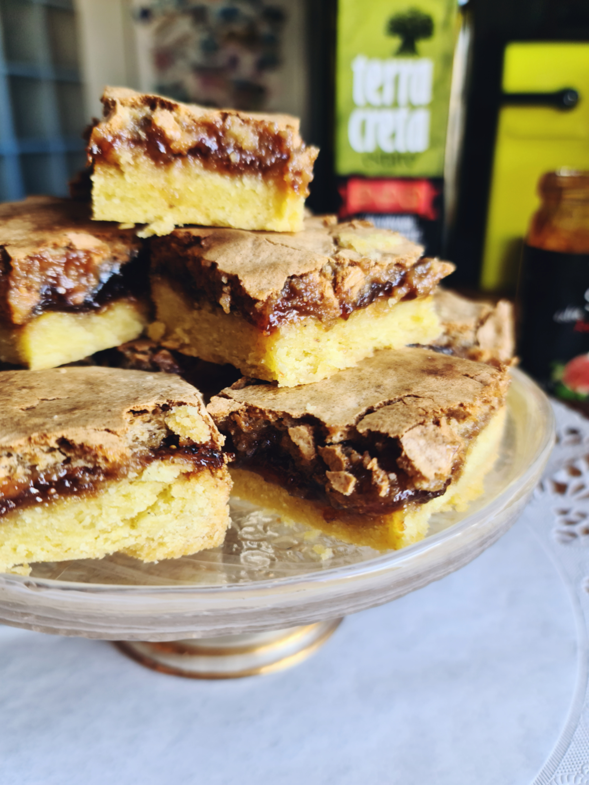 De cand am descoperit uleiul de masline Terra Creta am zis ca e prea misto sa-l folosesc doar la preparate sarate, asa ca am incercat sa fac un aluat fraged, pe reteta de la prajitura rasa a lu’ mamaie. Uleiul e aromat cu iz de citrice, asa ca e perfect pentru aluaturi. Iar textura a iesit de vis. Deloc sfaramicios, desi am taiat cat inca era calda.